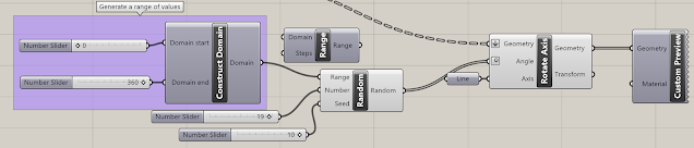 Using the random function, I found that I was also able to take each ring of branches and rotate each one individually. This took a lot of trial and error, as I found that the random feature would often apply the same angle change to every single piece. (I did the testing for this before I did the regular rotation animation seen above). Initially, I tried using range between the construct domain and random but I found that no matter what I changed the steps to, each random would be a specific segment of angles. For example, using 18 steps (gave me 19 outputs for my 19 branch layers) would create a range of 0-20 degrees, 21-40, etc. While this is still random I found that it created a more subtle random than I was hoping for, so I directly connected my construct domain (0 - 360 degrees) to the random feature. Seed was the slider I used for the animation and number was the number of slices I had. I found that the animation was choppy and felt less like a gif, so I also animated the trunk through the distance slider (material thickness) to create a consistency for reference. Of course, the rotate axis geometry had to be flattened or else all the branches would collectively be rotated 19 times and overlap to create a weirdly spikey star.